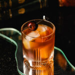 • Strain into an ice filled rocks glass and garnish with a cherry.